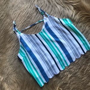 Blue/Green/Grey/Black/White striped crop tank top with adjustable straps and scalloped bottom detail