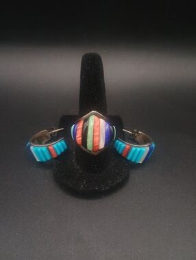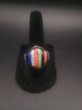 Bold striped inlay ring with alternating colorful panels. turquoise, spiny oyster, coral, jet and lapis. Sterling band. Eye-catching and vibrant piece. stamped eagle workshop. Matching earrings not included.