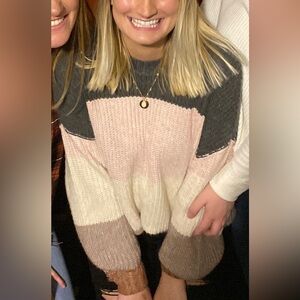 Cozy knit sweater with stylish color blocking stripes. Features pink, cream, and brown colors.