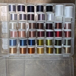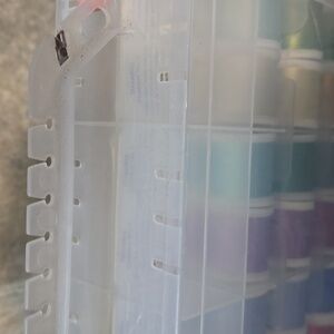 Keep your threads neatly organized with this clear storage container with 82 spools of rayon thread. Threads can come out of the top of the box and also cut there. The thread has a metallic sheen to it except the 2 lg white spools. Only a couple of spools have been slightly used. Sells for $99.00 on Amazon.