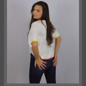 Mix it up in this boxy top that features colorful trim and curved hem.