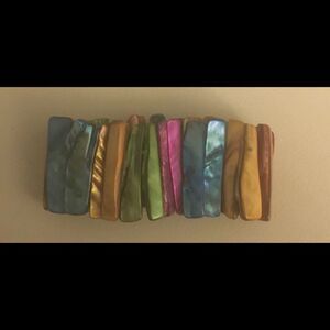 This gorgeous handcrafted stretch bracelet looks great with any fashion style! Bright multi colored genuine mother of pearl gemstone pieces come together for a one of a kind look. It is super comfy and 1.25” in width. Great gift idea, too!