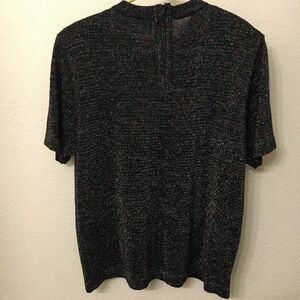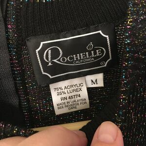 This multi color sparkle top is from Rochelle of California. The item is short sleeve with a zipper on the back of the neck. The top is black with different color threads woven in to create this sparkle appearance. The item is made out of 75% acrylic and 25% lurex. The size is medium. The measurements of the top are 28" L x 21" W x 11" sleeve (shoulder to cuff). The top has been pre-owned but is in great condition.