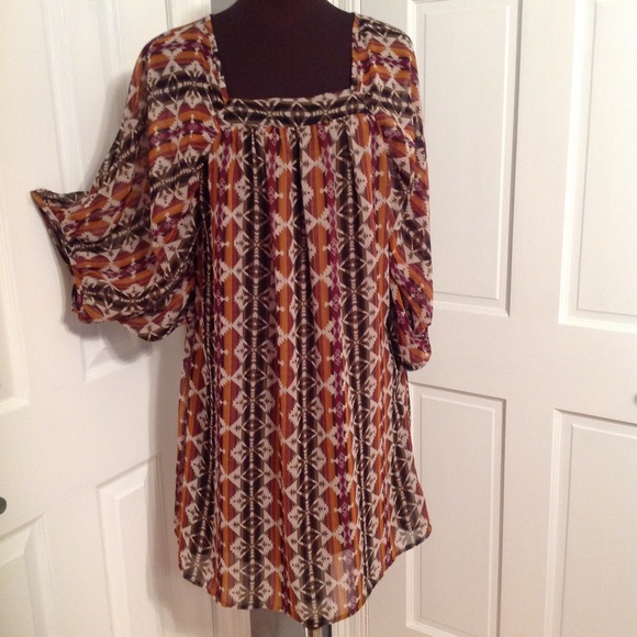 Very pretty colored square neck dress with 3/4 sleeves. Fully lined. 34" from top of back to hem. EUC
