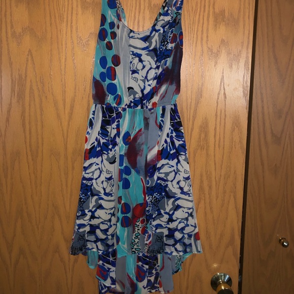 Twirl at any occasion in a light, flowy multi-colored and patterned high-low dress. Features a flattering neckline, an elastic midline for stretch and comfort, and a crisscrossed back design.