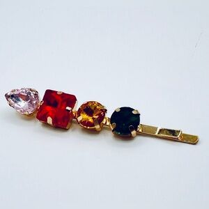 Gold metal bobby pin featuring four large rhinestones, one emerald green round, one gold round, one red square, and one light pink pair shape stone. New.