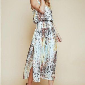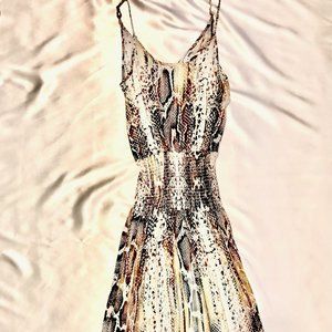 Light and airy multi-colored snake print midi length dress in a soft rayon fabric. Features a smocked waist, adjustable spaghetti straps and side slit on one side. Unlined.