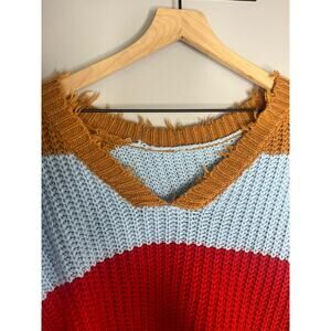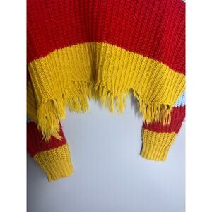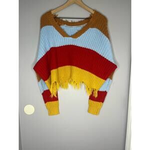 Multi-Colored Stripe Knit V-Neck Sweater with Fringe