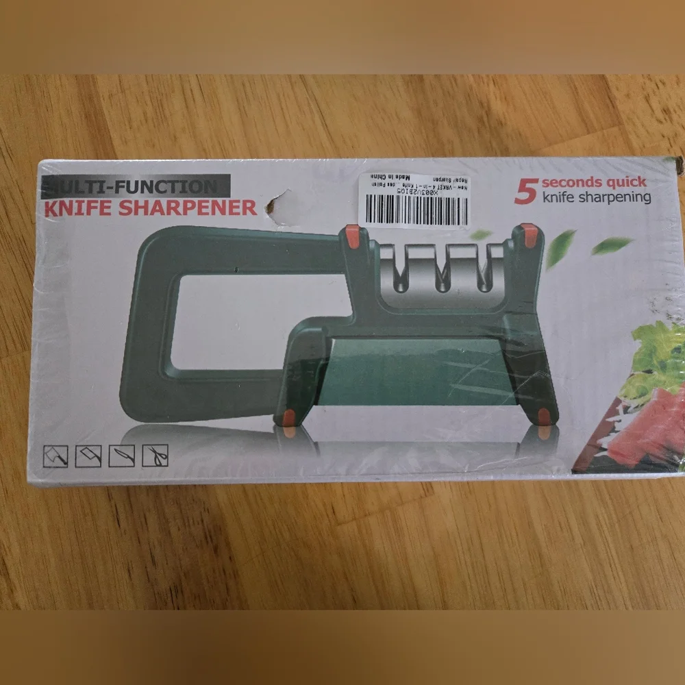Green multi-function knife sharpener. Quick and efficient sharpening.