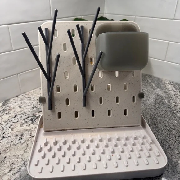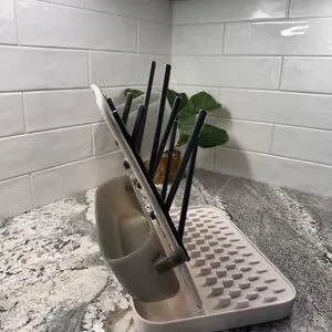 Versatile kitchen drying rack with a modern design. Features a cream base with black branches and a gray container. Ideal for organizing utensils and small items.