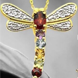 18kt gold-plated sterling silver dragonfly pendant adorned with a splendid array of multi-colored gemstones. The harmonious blend of gemstones and gold plating creates a truly enchanting pendant that is sure to capture hearts.