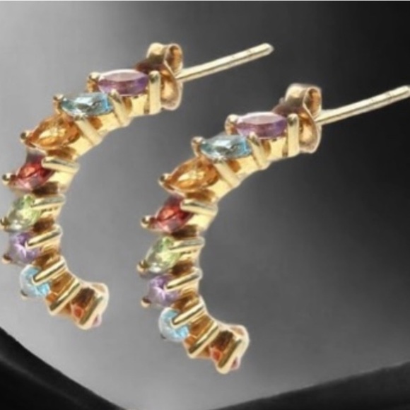 18kt gold-plated sterling silver jewelry. These hoop earrings are adorned with a splendid array of multi-colored gemstones. The harmonious blend of gemstones and gold plating creates a truly enchanting pair of earrings that are sure to capture hearts.