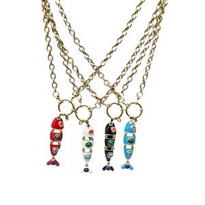 This beautiful necklace features a multi-gemstone fish pendant with black enamel, set on an 18K gold plated chain. Perfect for adding a touch of elegance to any ensemble.