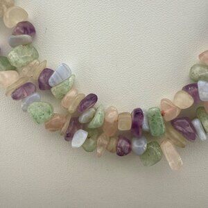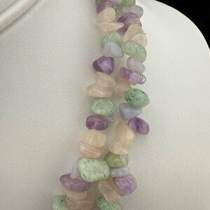 Multi-Gemstone Chip Beaded Long Strand Necklace Pastel Colors Green Pink & Laven