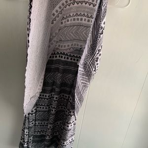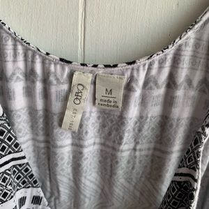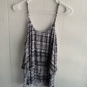 This multi-patterned tank top is so fun and comfy! It is incredibly soft and fun. There are two layers to the top. It can easily be tucked up to make a crop top or wear it with both layers. Pretty oversized and I bought the medium when I wore a Large. There is no damage or staining to the top and only worn a few times