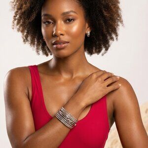 The layered design gives you that effortless stacked look in one easy-to-wear piece — bold, glamorous, and perfect for elevating both casual chic and evening glam outfits. Whether you're styling it with a sleek black dress or adding sparkle to a daytime look, this bracelet delivers luxury energy every time.