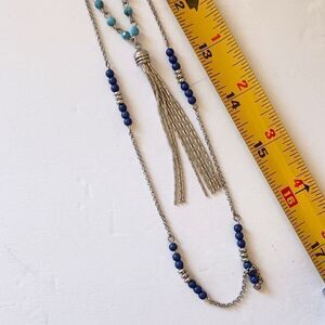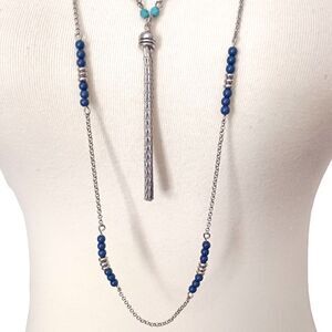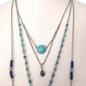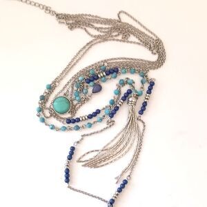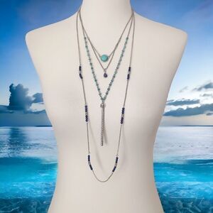 Multi Layered Beaded Chain Necklace Ocean Blues Aqua Silver Tone Western Boho. Condition is pre-owned and EXCELLENT condition. No loose/missing beads or signs of wear. Measures about 34". Unbranded. Please see all photos for detailed condition.