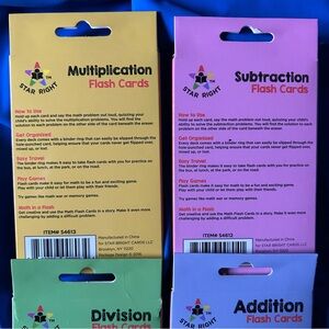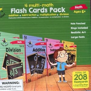 4 Multi-Math Flash Cards Pack. This Set Includes 4 Boxes of Cards: Addition, Subtraction, Multiplication, and Division. 208 Flash Cards, For Ages 6+. All Cards are Hole Punched and Include 4 Organizing Rings. These are a Great Tool for Practicing Math. This Set is in Close to New Condition, 2 of the Boxes Opened and Used Once. There is One Slight Imperfection on the Outer Box, and 2 Boxes Inside that Have Been Opened (View Images).