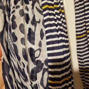 Infinity Scarf with two different patterns split along the middle of the scarf. One half of the fabric has a white, blue, and yellow striped pattern while the other pattern has white or blue spots against a blue or white background.
