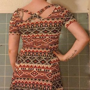 Fitted dress from H&M with multiple patterns, burnt orange and navy blue. Length hits above the knee on me (I’m 5’3”). Very cute and shapely, a perfect summer dress!
