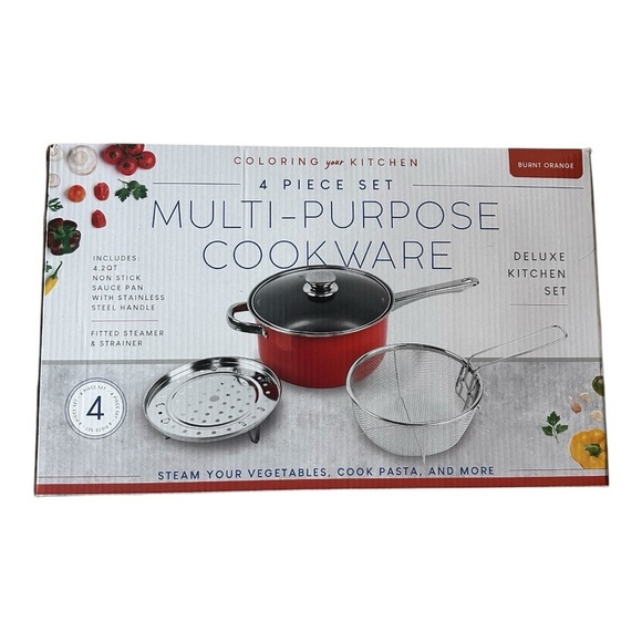 Upgrade your kitchen with this versatile 4-piece Multi-Purpose Cookware Set in a stylish burnt orange color. Perfect for steaming vegetables, cooking pasta, and more!