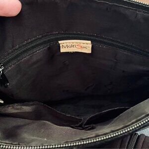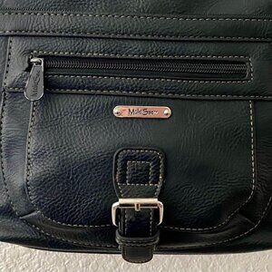 GOOD used condition The zipper tabs have some wear, but are still functional Exterior Features: *Two front zipper pockets *1 Slip pocket under buckle tab *Cell phone slip pocket on back *Top zipper closure Interior Features: *Back wall zipper pocket Material Interior: Polyester Material Exterior: Non-Leather Size: 8.25" L, 9.375" H, 2.375" W Strap Drop: 26.5" **Washable** Wash in cold water with mild detergent. Wash separately in a mesh bag, delicate cycle. Reshape bag after washing & line dry