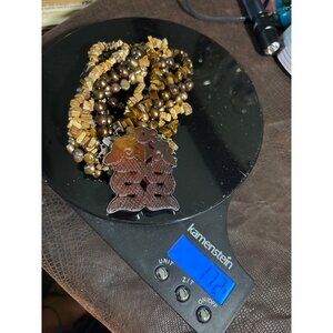 Earthy design combines elegance and natural elements, featuring bronze pearls, tiger's eye, jasper, and an intricate hand carved double dragon jade pendant. This pendant style represents happiness associated with luck and prosperity.