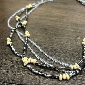 This multi-strand necklace features a stunning combination of black, cream, and clear colored beads.