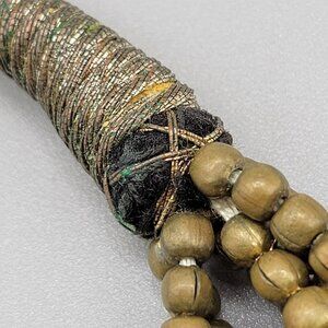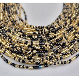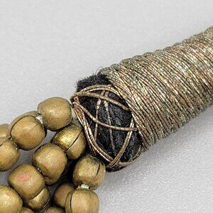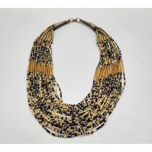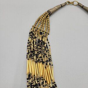Bib style multi-strand beaded necklace. The beads feel like glass of gold and black. Long gold beads with smaller length beads and seed beads. One single blue seed bead on the longest strand. Unbranded.