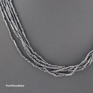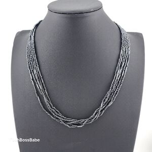 This elegant necklace features multiple strands of sleek black glass beads, combining both round and tube-shaped beads for a dynamic and textured look. Measuring 19" in length, this piece sits perfectly at the collarbone, making it ideal for both casual and formal wear. The reflective glass beads add a subtle shimmer, creating a sophisticated accessory for any wardrobe.