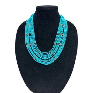 Multi-Strand Faux Turquoise Beaded Statement Necklace Silver Tone Boho Chic