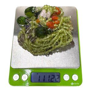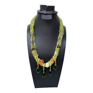 Make a statement with this stunning multi-strand necklace featuring vibrant peridot beads, orange and purple accent stones, and faceted green drops. Perfectly designed to elevate your outfit effortlessly.