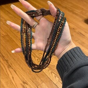 Enhance your style with this elegant multi-strand necklace. Featuring rich brown and shimmering gold tones, this piece adds a touch of sophistication to any outfit.