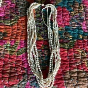Multi-strand mix of fresh water and round faux pearls. Creamy white color. About 14” long.