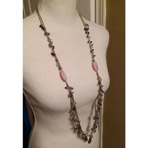 Long Length Multi Strand Multi Stone Silver Tone Statement Necklace. Resin & Alloy. Length 39", Extender 4". Lobster Clasp. Earrings Fish Hook 2.5". Light Purple/Silver. As is.