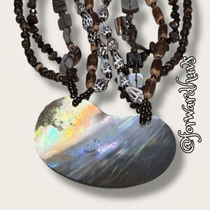 This striking multi-strand necklace blends natural textures and bold design, featuring a mix of shell and wood beads in earthy tones. The layered strands create a rich, tactile look, while the centerpiece—a large black pendant measuring 1.5” x 3.75”—adds dramatic flair and visual weight.