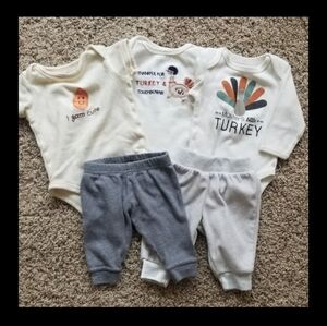 Multibrand 5 Piece 0-3M Thanksgiving Bundle. Chickpea Long Sleeve "Thankful for Turkey and Touchdowns" Onesie. Chickpea Long Sleeve "Mommy's Little Turkey" Onesie, Touched By Nature Short Sleeve "I Yam Cute" Onesie, Bundles Dark Grey Pants, Carter's Simple Joy's Light Grey Sweatpants.