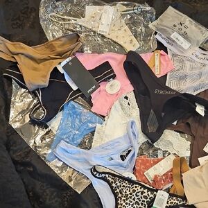30+ pairs for 1 price. Diverse Brands, collection of thong panties in various colors and patterns. Includes leopard print, stripes, and solids.