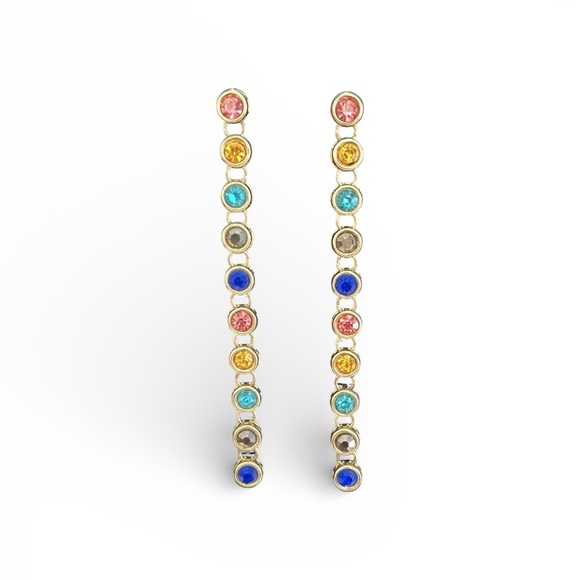 Elegant multicolor drop earrings featuring vibrant stones in gold settings. Perfect for adding a pop of color to any outfit.