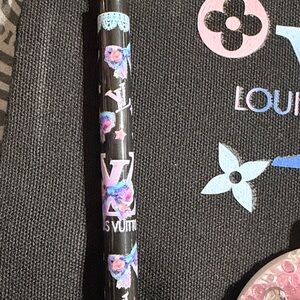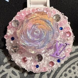 Multicolor 5 piece Accessory Set. Includes matching canvas pouch with acrylic charm zip pull, pen, compact mirror, sanitizer spray bottle and mini perfume atomizer.