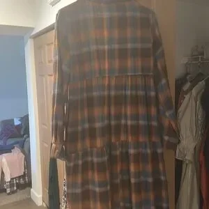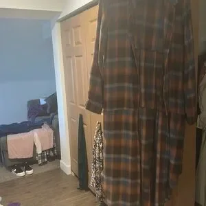 Nice fleece long jacket wear with jeans and usually a short sleeve blouse it does have a hole in the left pocket but if you can see it’s a easy fix