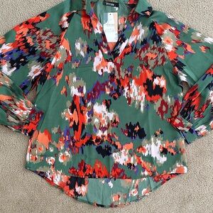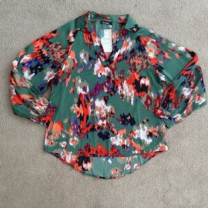 Vibrant blouse with abstract pattern. Features a mix of green, red, and purple hues. Ideal for a bold look.