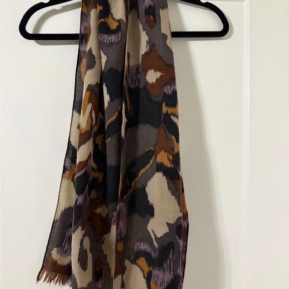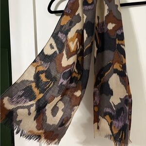 This beautiful scarf ties together shades of brown, tan, grey, black, and a hint of purple. It’s on the shorter side so better for a petite person or to be worn untied. Great for dressing up an outfit. And would go with almost any color!