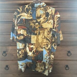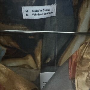Stylish garment with a multicolor abstract pattern. Features shades of brown, gold, and black.