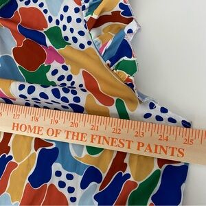 Bright multicolor abstract print top with playful ruffle sleeves. Lightweight, breathable fabric for all-day comfort. Easy pull-on style with a soft gathered neckline. Great for casual wear or pairing with shorts and skirts. Color: multicolor.