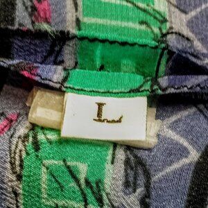 Soft short-sleeve silk top with shoulder pads, side slits and keyhole back closure in a bright teal blue, purple, magenta and black abstract print.