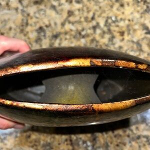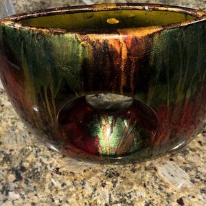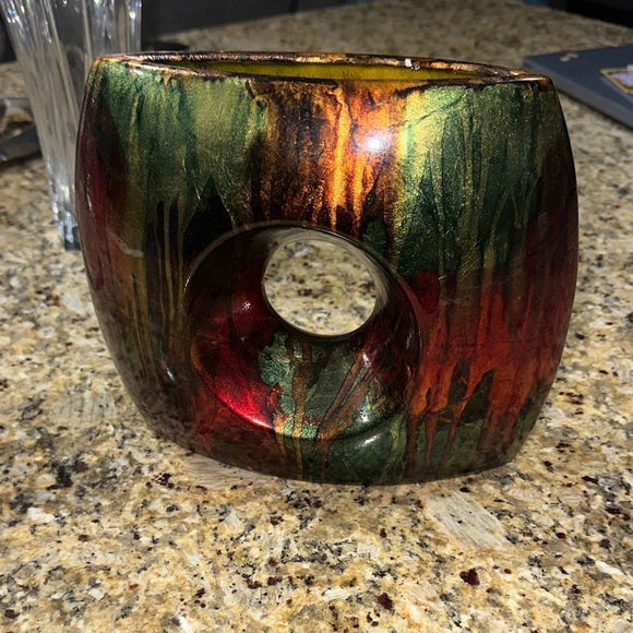 Unique multicolor abstract vase with a circular cutout. Features vibrant red, green, and gold hues.