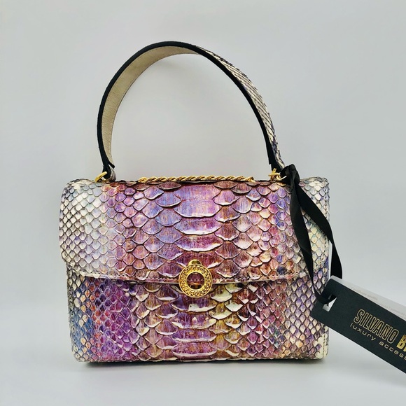 Silvano Biagini Top Handle Bag, Multicolor Python (REAL SNAKE SKIN see tag for details) Gold-Tone Hardware, Flat Handle & Single Shoulder Strap, Suede Lining with Single Interior Pocket, Snap Closure at Front. New with tags! If you haven’t heard of this designer please look them up this is a gorgeous bag! Comes with dust bag. Happy to negotiate!