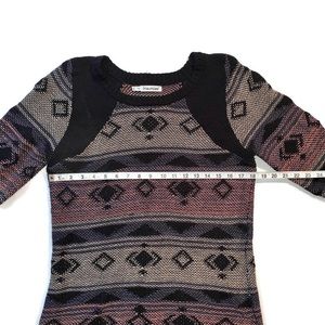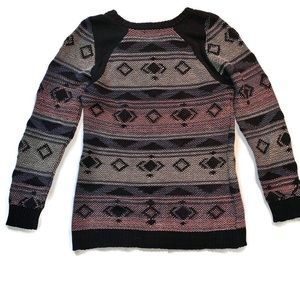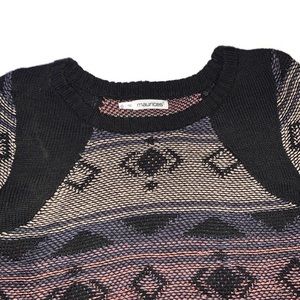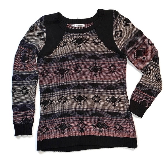 Size M. Multicolored Maurices sweater with an Aztec inspired pattern. Soft cotton/acrylic blend. Pattern on front, arms, and back with solid black on shoulder and collar. The tag has a 0 on it but I wear a Medium and fit in this sweater. Please see measurements in pictures. There are two small snags, barely noticeable (pictured).