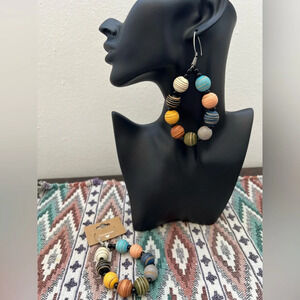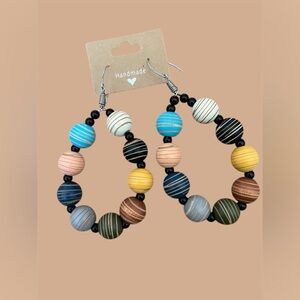 These earrings feature a vibrant mix of blue and orange beads arranged in a hoop design, offering a playful and eclectic touch to any outfit. The beads vary in texture, adding depth and interest to the overall look. Perfect for adding a splash of color to your ensemble.